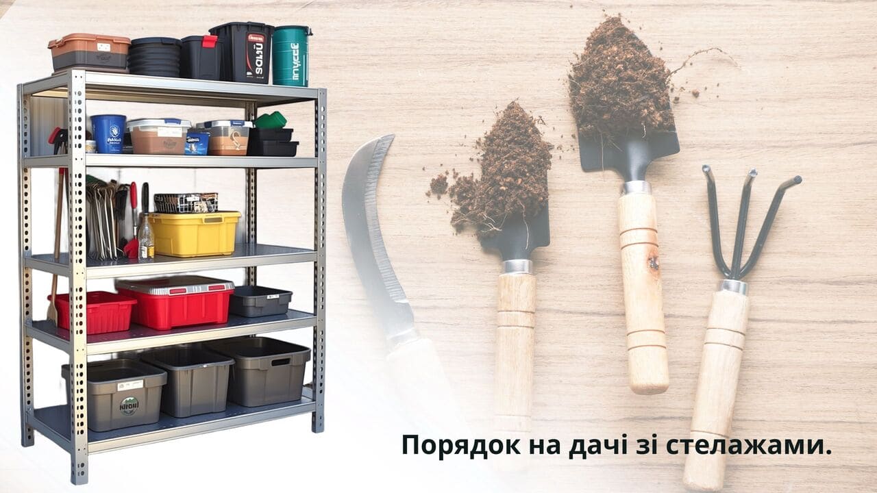 Почніть із простого: розділіть зони. Окрема полиця для інструментів, інша для добрив, окрема для банок чи посуду. Так ви не тільки знайдете все швидше, а й уникнете неприємних запахів, якщо щось просиплеться чи прольється.