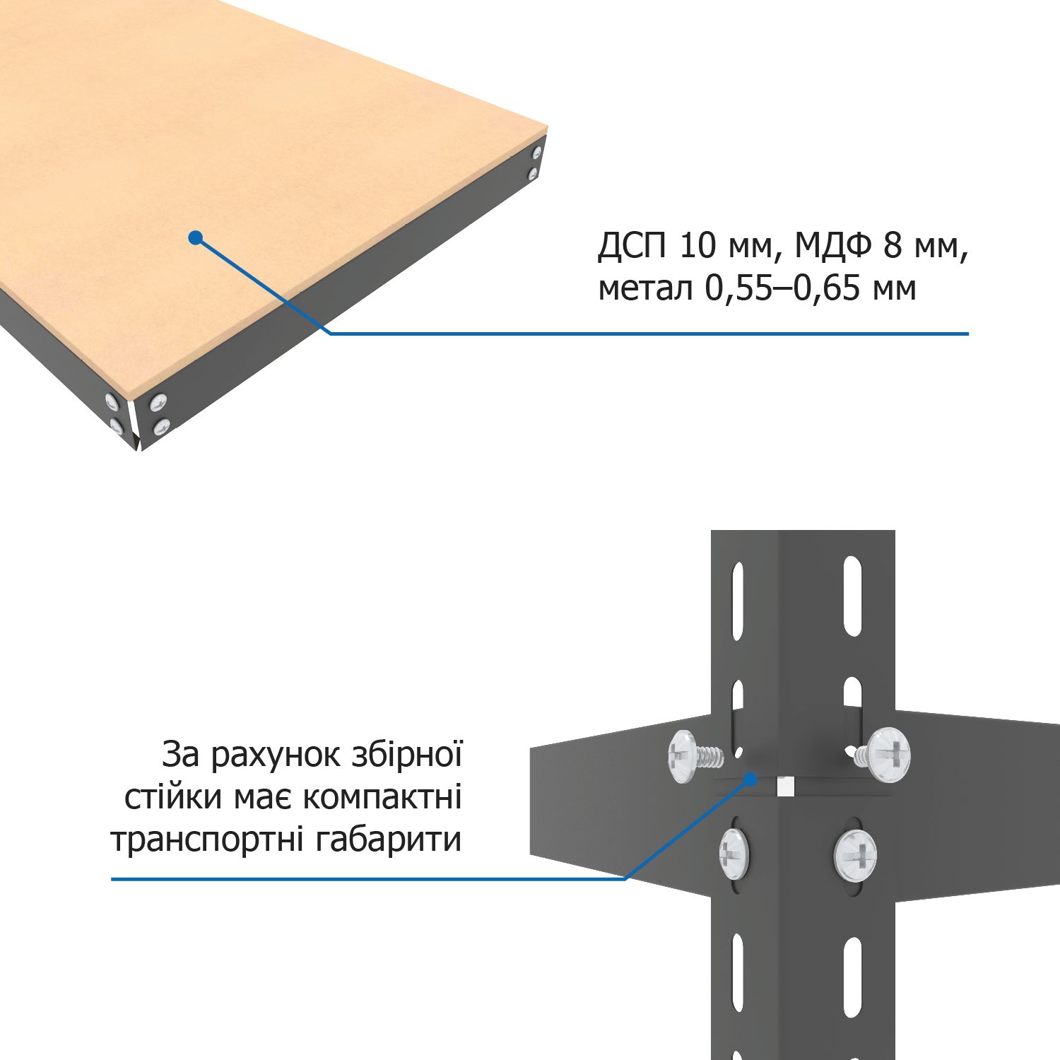 Безболтове кріплення (на зачепах) дозволяє швидко збирати й переставляти полиці, що фіксуються завдяки спеціальним зачепам, без додаткових інструментів.
