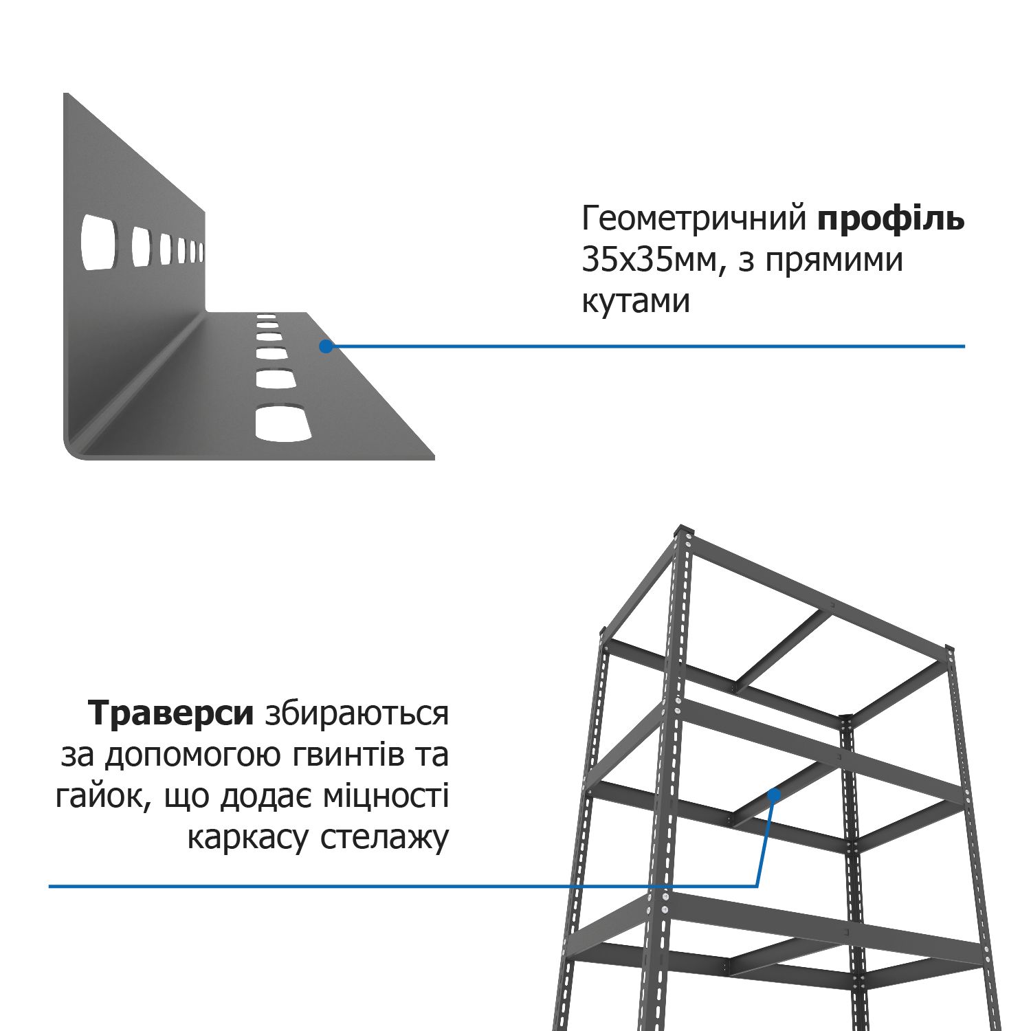 Рама виготовляється з міцного сталевого профілю, товщина якого безпосередньо впливає на загальну жорсткість та вантажопідйомність конструкції. Чим більша товщина металу, тим стелаж стійкіший до деформацій, краще витримує динамічні та статичні навантаження й зберігає форму навіть за тривалої експлуатації.