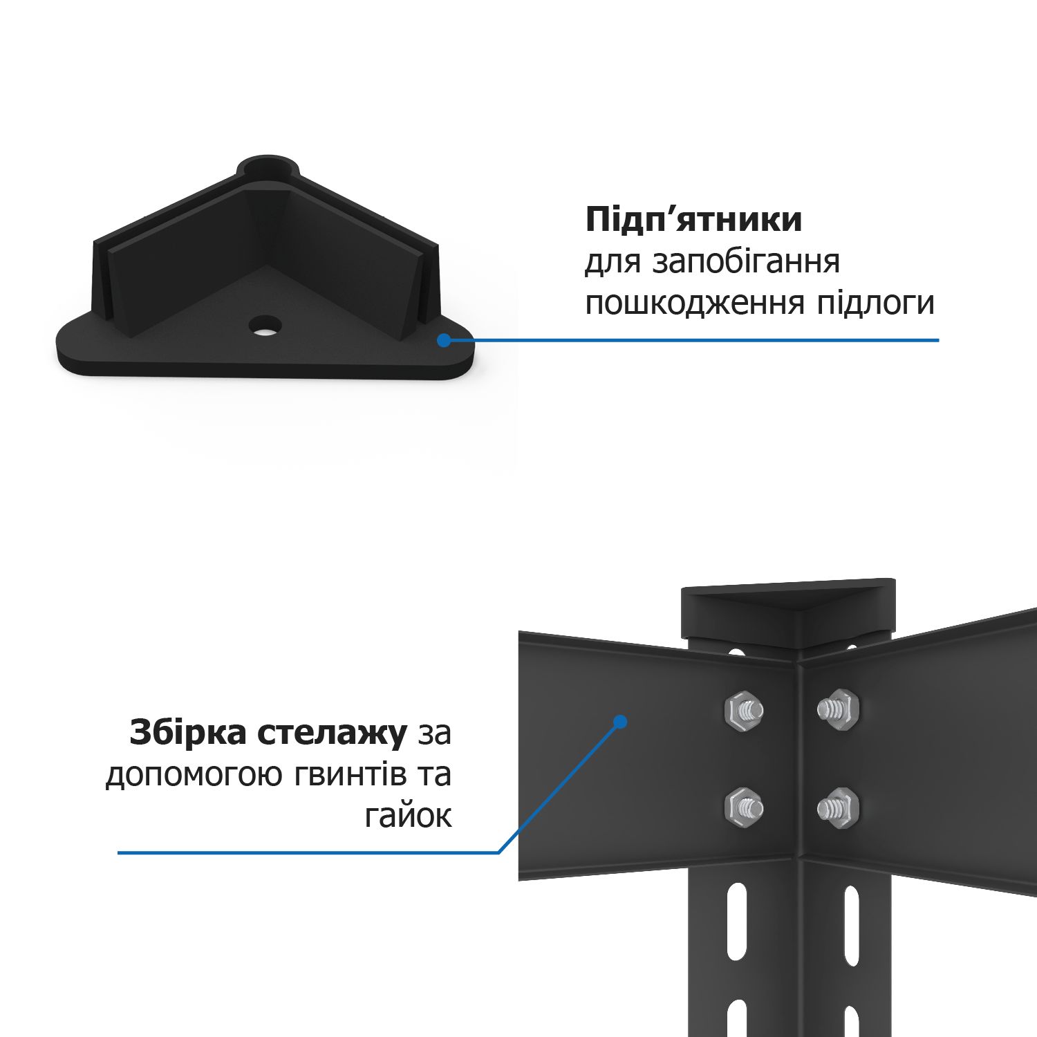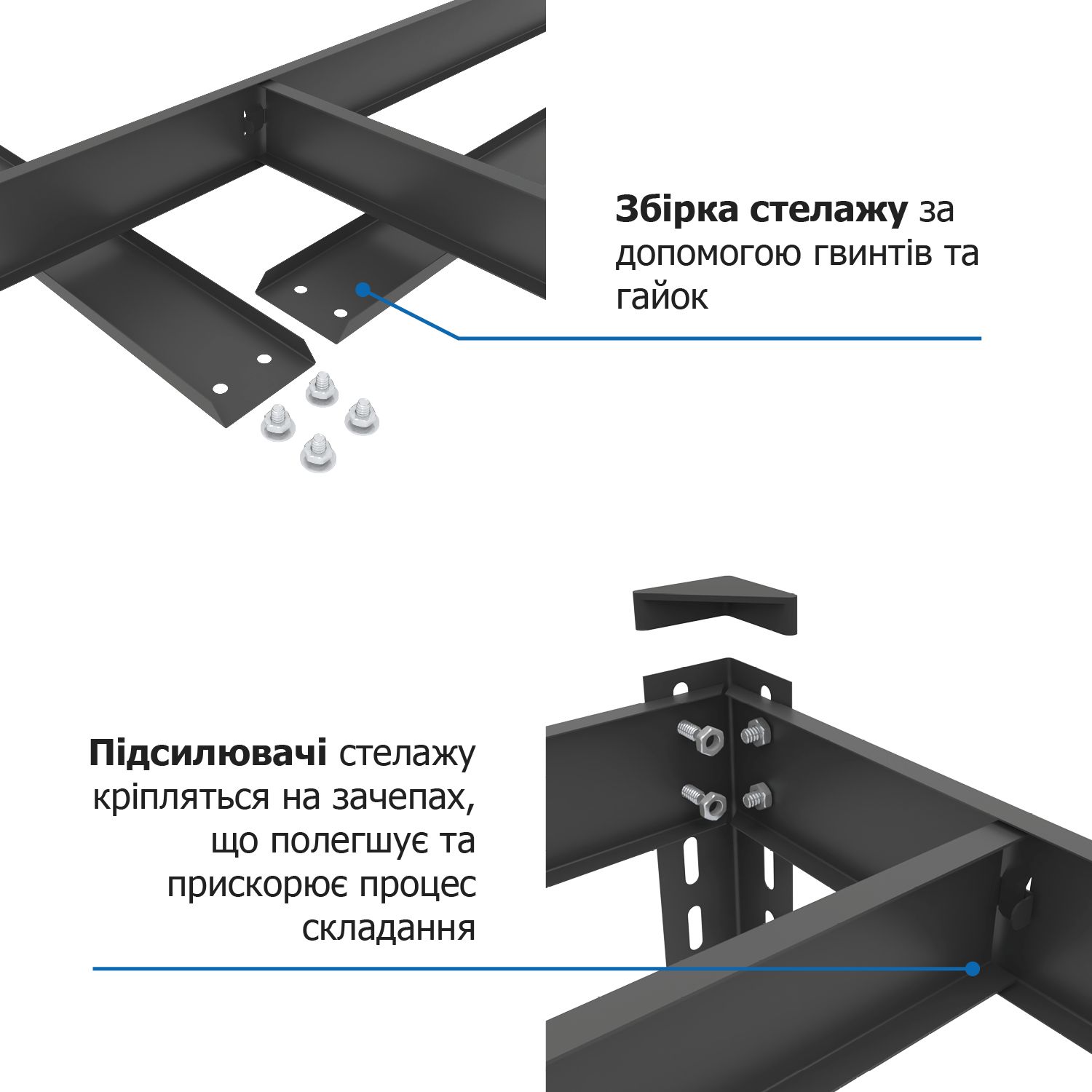 - Полиці монтуються на болтах, для додаткової стабільності конструкції.