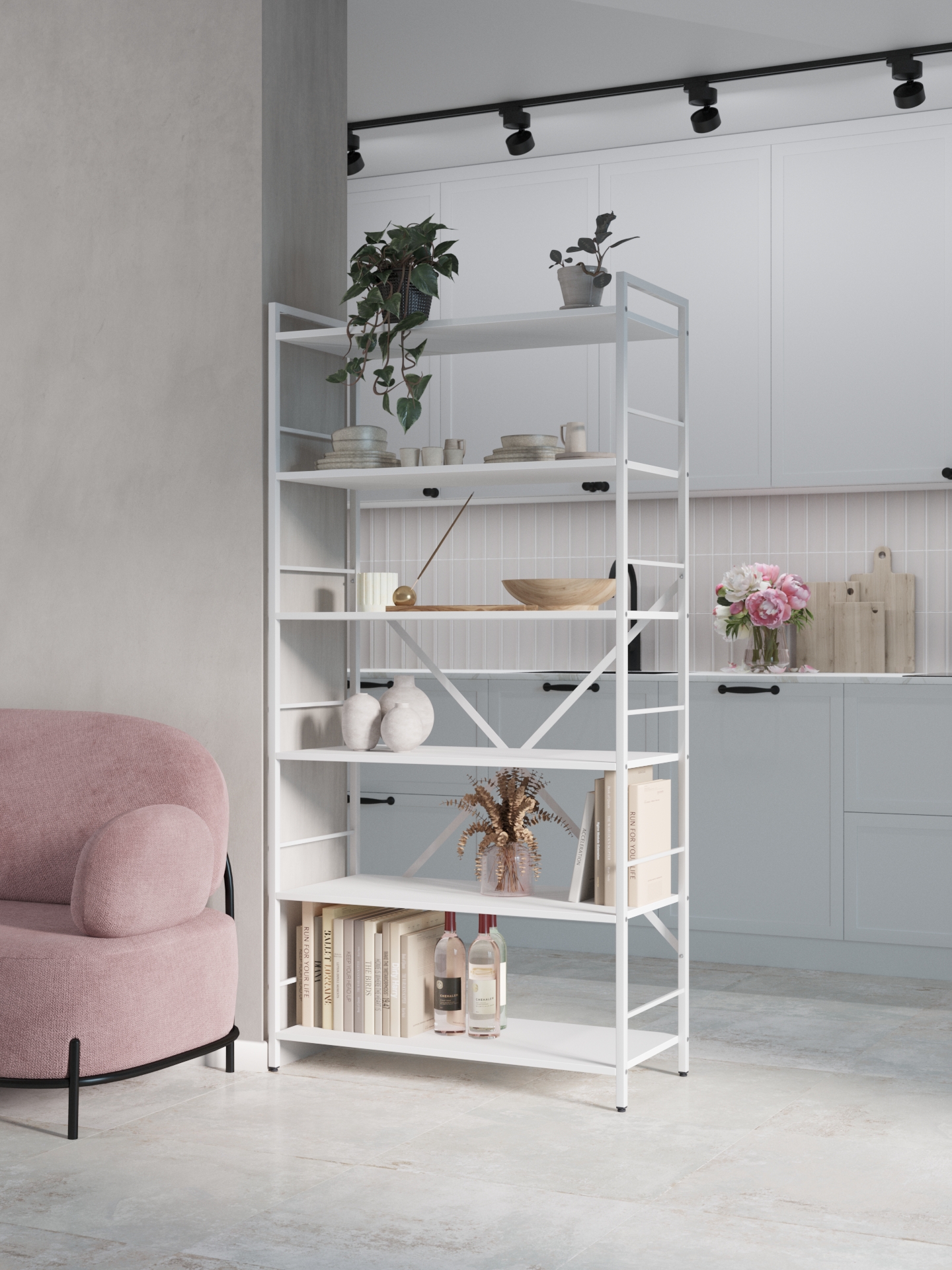 Модель доступна у двох варіантах каркаса: Білий або Антрацит. Полиці можна вибрати у відтінках Антрацит, Білий Сніг та Дуб Артизан.