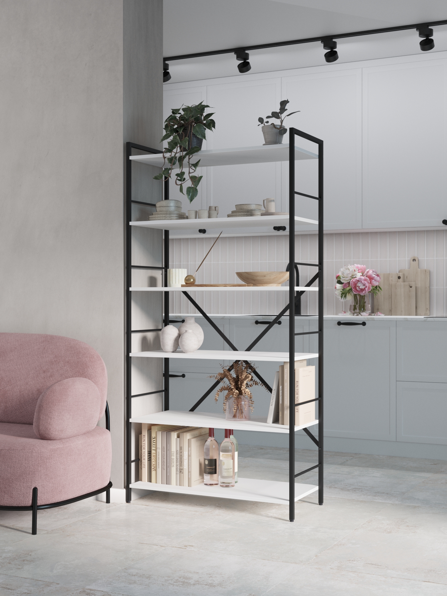 Модель доступна у двох варіантах каркаса: Білий або Антрацит. Полиці можна вибрати у відтінках Антрацит, Білий Сніг та Дуб Артизан.