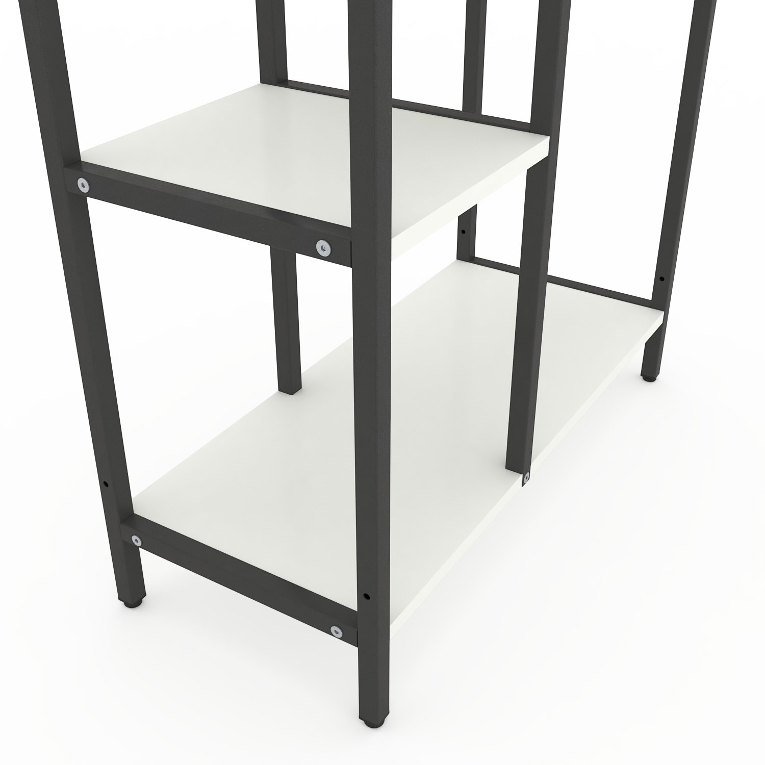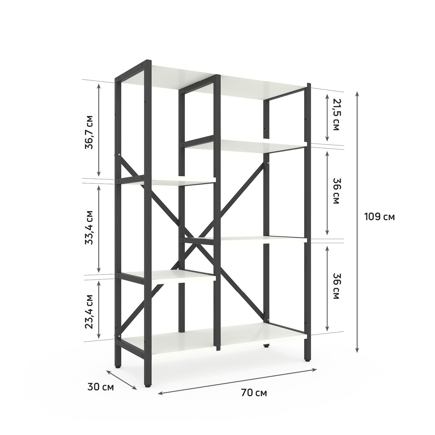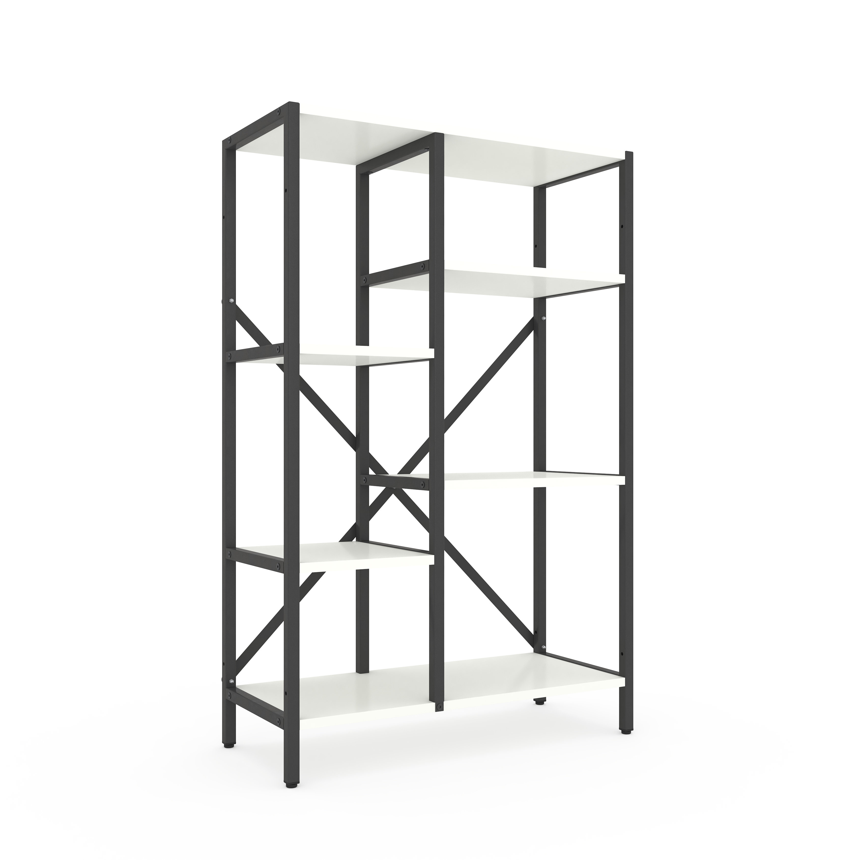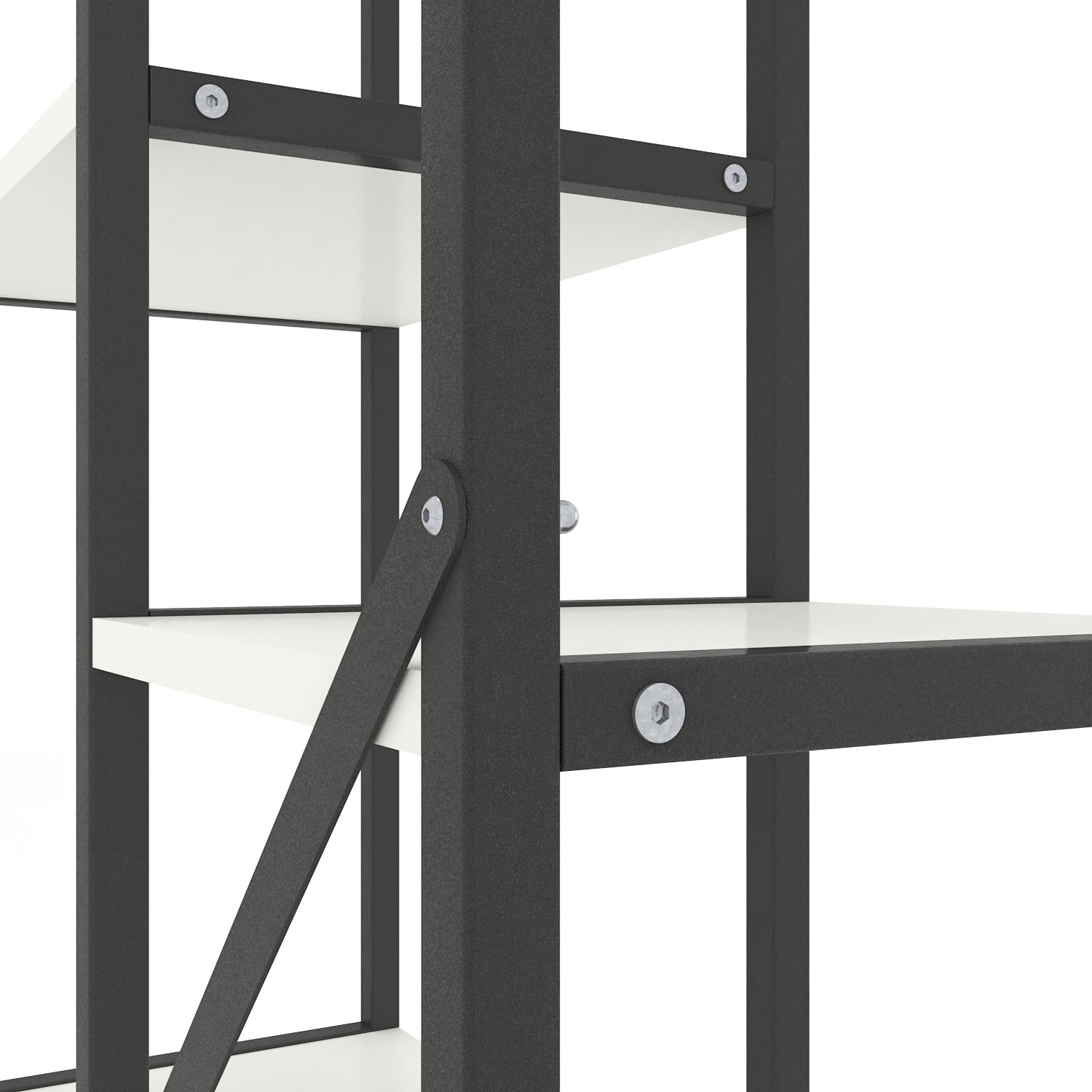 Модель доступна у двох варіантах каркаса: Білий або Антрацит. Полиці можна вибрати у відтінках, які часто застосовуються як базові в лофт-дизайні.