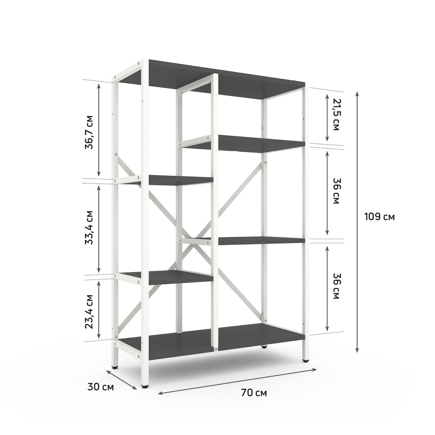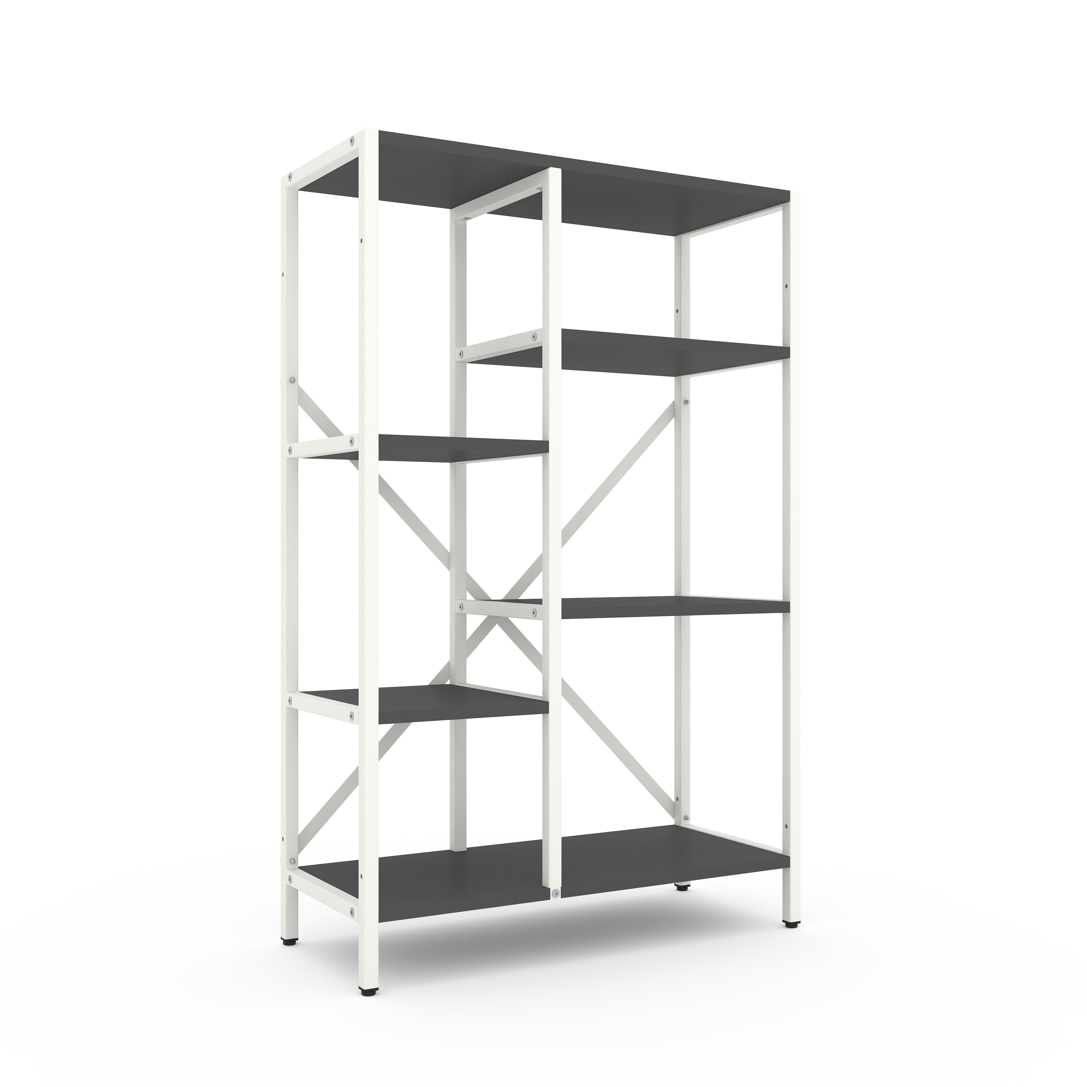 Модель доступна у двох варіантах каркаса: Білий або Антрацит. Полиці можна вибрати у відтінках, які часто застосовуються як базові в лофт-дизайні.