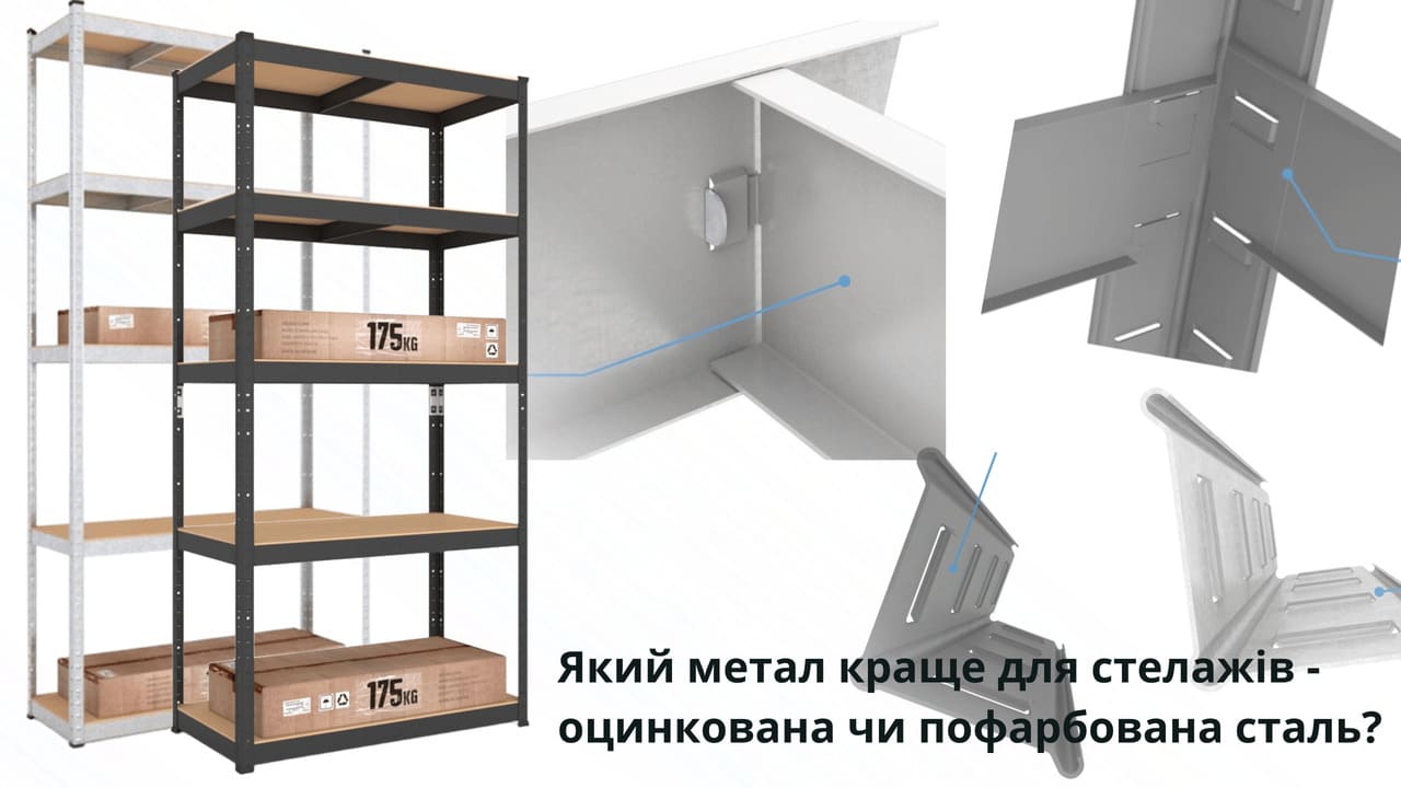 Оцинкована сталь - краще рішення. Тут важлива стійкість до вологи, пилу, перепадів температур і ударних навантажень. Цинковий шар надійно захищає метал, навіть якщо стелаж стоїть біля воріт або зовнішньої стіни.
